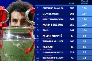 欧冠历史参与进球榜:梅罗前二,萨拉赫98场71球位列第13位