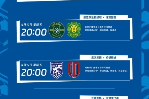 4月17日20:00,浙江俱乐部绿城vs北京国安