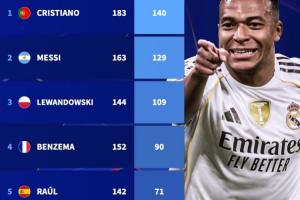 姆巴佩仅差劳尔1球!欧冠历史射手榜:C罗第1 哈兰德第7 凯恩第10
