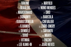 前锋:7-克瓦拉茨赫利亚、9-贡萨洛·拉莫斯、10-登贝莱、14-杜埃、29-巴尔科拉、49-姆巴耶